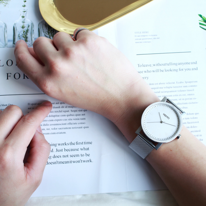 極簡輕薄系列–純粹款以極簡主義為設計主軸,潔淨優雅的錶盤及凹痕設計而成的羅馬數字與細緻工藝製作成的指針和不鏽鋼錶身搭配之下,傳達出最初與簡單的涵義,全錶款採用不銹鋼材質,並採用抗磨損藍寶石水晶玻璃及瑞士機芯。也是男女皆可配戴的情侶錶,另可搭配尼龍錶帶。