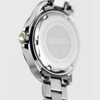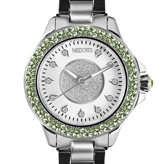 Farfalla.D 法蝶系列運用少見的閃粉做為核心,搭配銀的特殊切割作為小時辨識,鑲上精細工藝加工後的寶石,營造華麗且脫俗的氣質,如同皇室般高尚典雅,受人尊敬,以較寬的時分針來加強時間的辨識度,傳達您的正直爽朗,配上夜光,在夜晚也能夠清晰的讀出時刻。