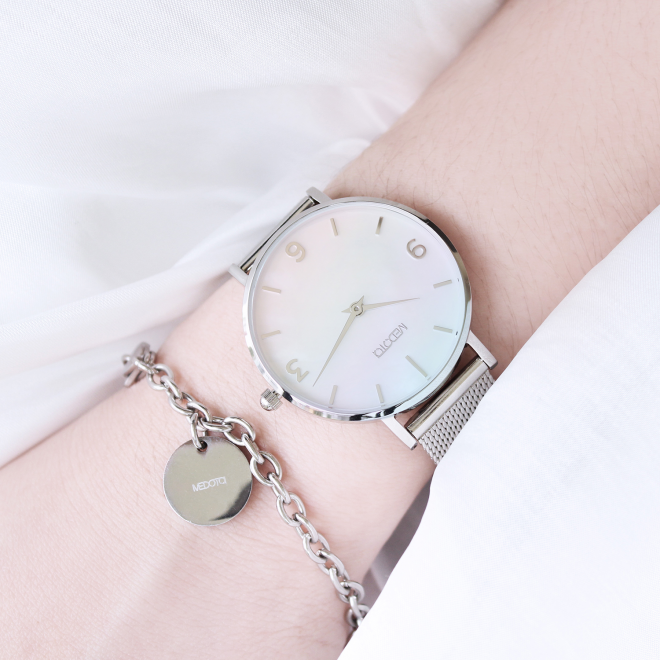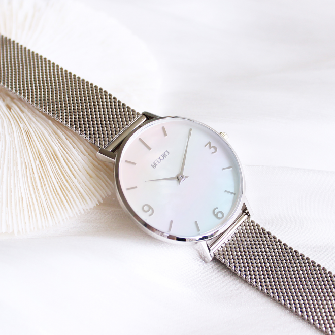 珍珠母貝具有獨特天然的紋路,透過精細的處理製成錶面,使配戴時,隨著不同角度的變化,