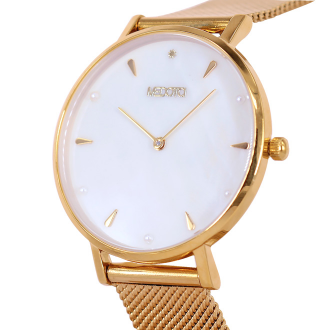 以希臘神話海洋女神名字命名的Thetis,靈感來自於浪漫的大海,將海洋中珍貴的貝殼作為錶款的主要基底,再運用美麗的珍珠點綴手錶的精緻感,錶殼與錶帶的部分則是以不鏽鋼為主。